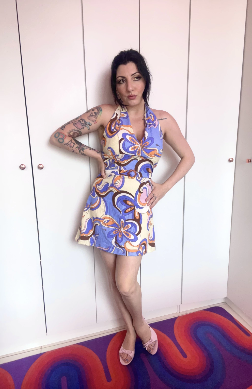 Mergulhe no clima hipnotizante dos anos 60 com o Vestido Daphne. A estampa psicodélica foi criada para transmitir ritmo e energia, enquanto a saia evasê traz leveza e aquele balanço característico das silhuetas retrô. O detalhe que amarra tudo é a fivela de acrílico em formato de flor, marcando a cintura com um charme lúdico e elegante. Uma peça feita para quem ama estilo, movimento e um toque de nostalgia vibrante.