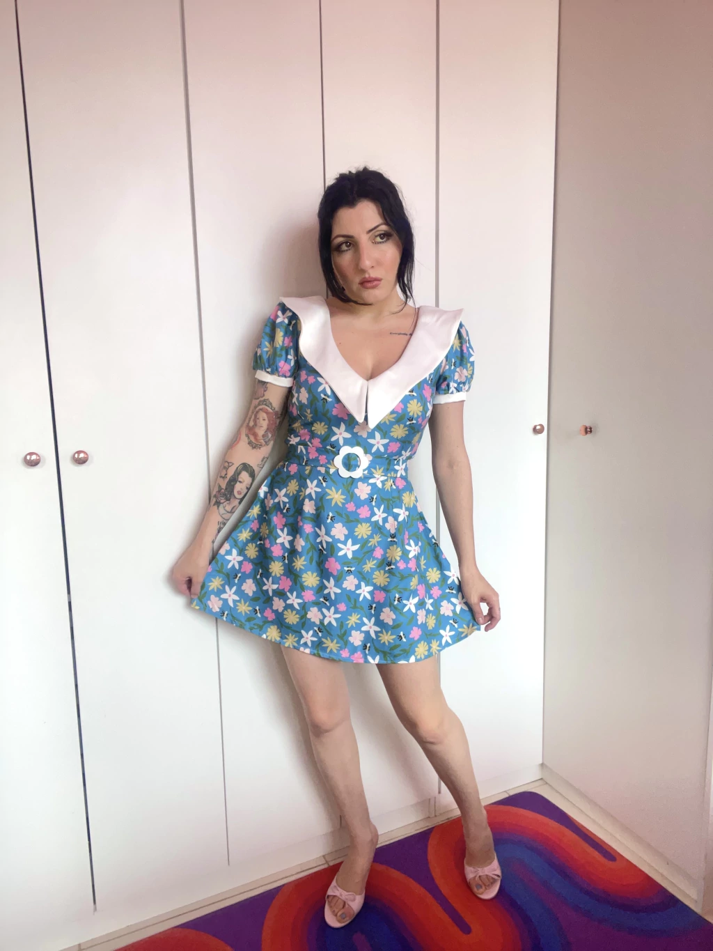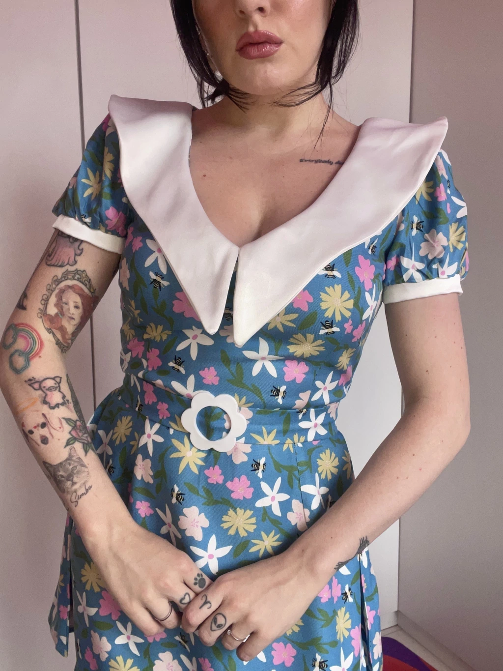 O amado Vestido Sweet 60’s resgata o encanto do nosso modelo clássico em uma versão ainda mais especial. Confeccionado em viscose sarjada com uma delicada estampa de abelhas, ele combina nostalgia e frescor de forma irresistível. Os punhos e a maxi gola brancos reforçam o ar boneca típico dos anos 60, enquanto o cinto com passante floral branco em acrílico adiciona um toque moderno e colecionável ao look. Um vestido que traduz inocência, estilo e personalidade.